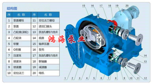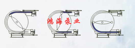 一根內(nèi)壁光滑、強(qiáng)度可靠的特制橡膠軟管安裝在泵內(nèi)部,通過(guò)一對(duì)壓輥沿著軟管旋轉(zhuǎn)擠壓,這樣的旋轉(zhuǎn)使得介質(zhì)往一個(gè)方向輸送而不會(huì)有倒流軟管在輸送介質(zhì)之后, 由被壓扁軟管的自身彈性和側(cè)導(dǎo)輥的強(qiáng)制下,管子恢復(fù)原狀,此時(shí),軟管內(nèi)產(chǎn)生高真空將物料吸入管腔;然后,物料在隨之而來(lái)的壓輥擠壓下從軟管內(nèi)排出。如此周而復(fù)始,物料不斷地被吸入和排出。